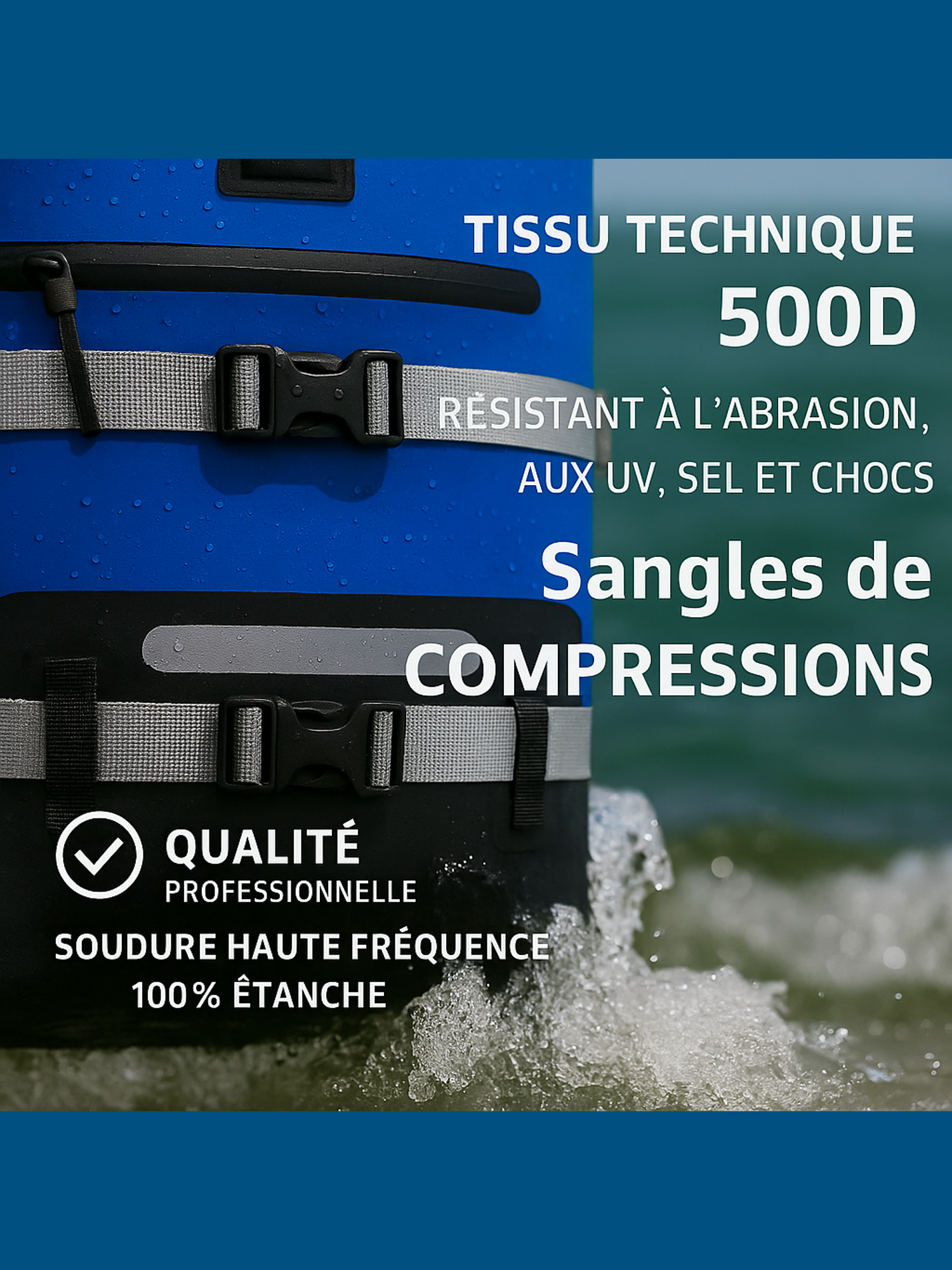 💦 Sous les embruns ou l’orage, vos affaires restent sèches — tissu PVC 500D soudé, 100 % étanche IPX6.